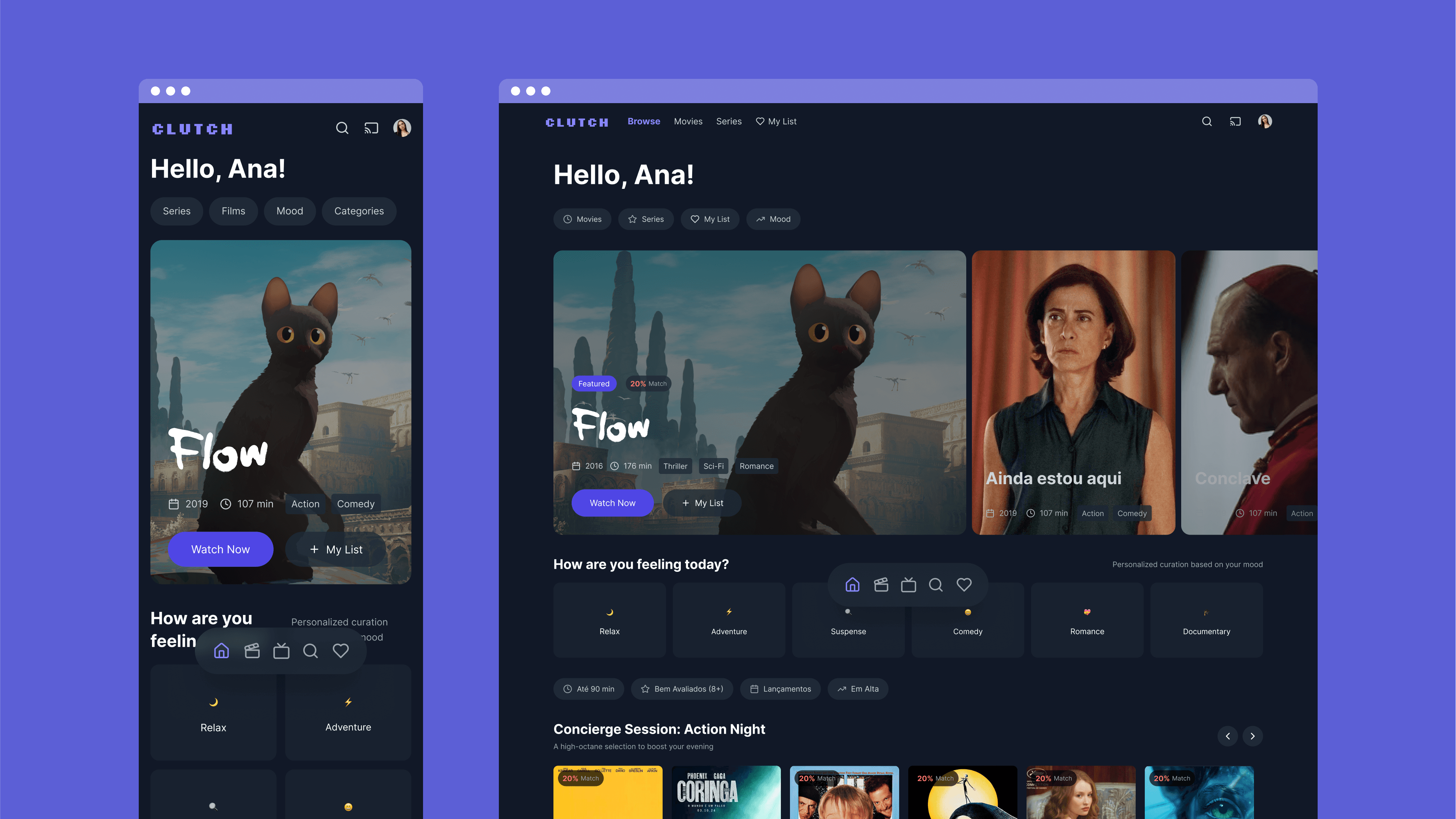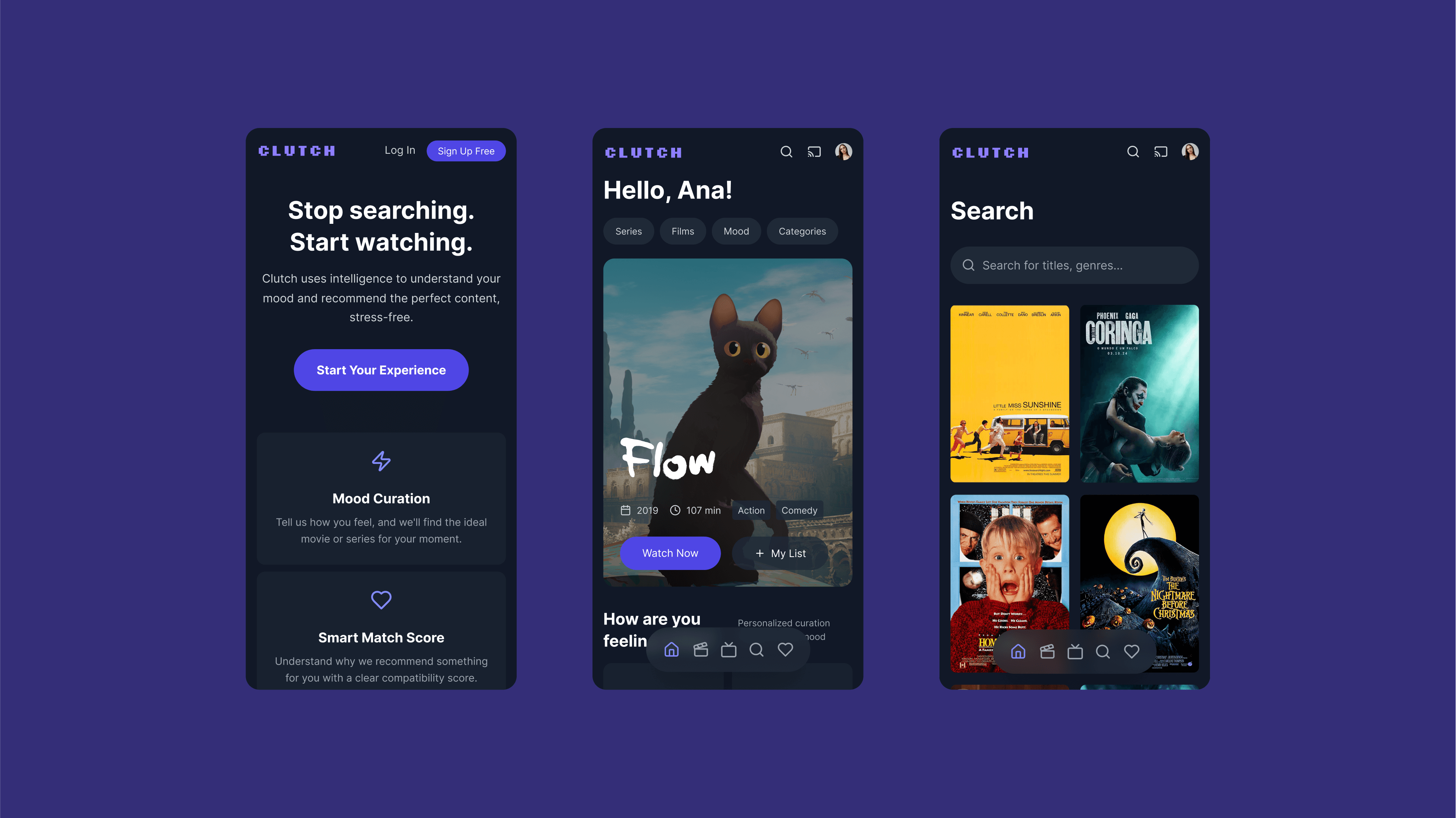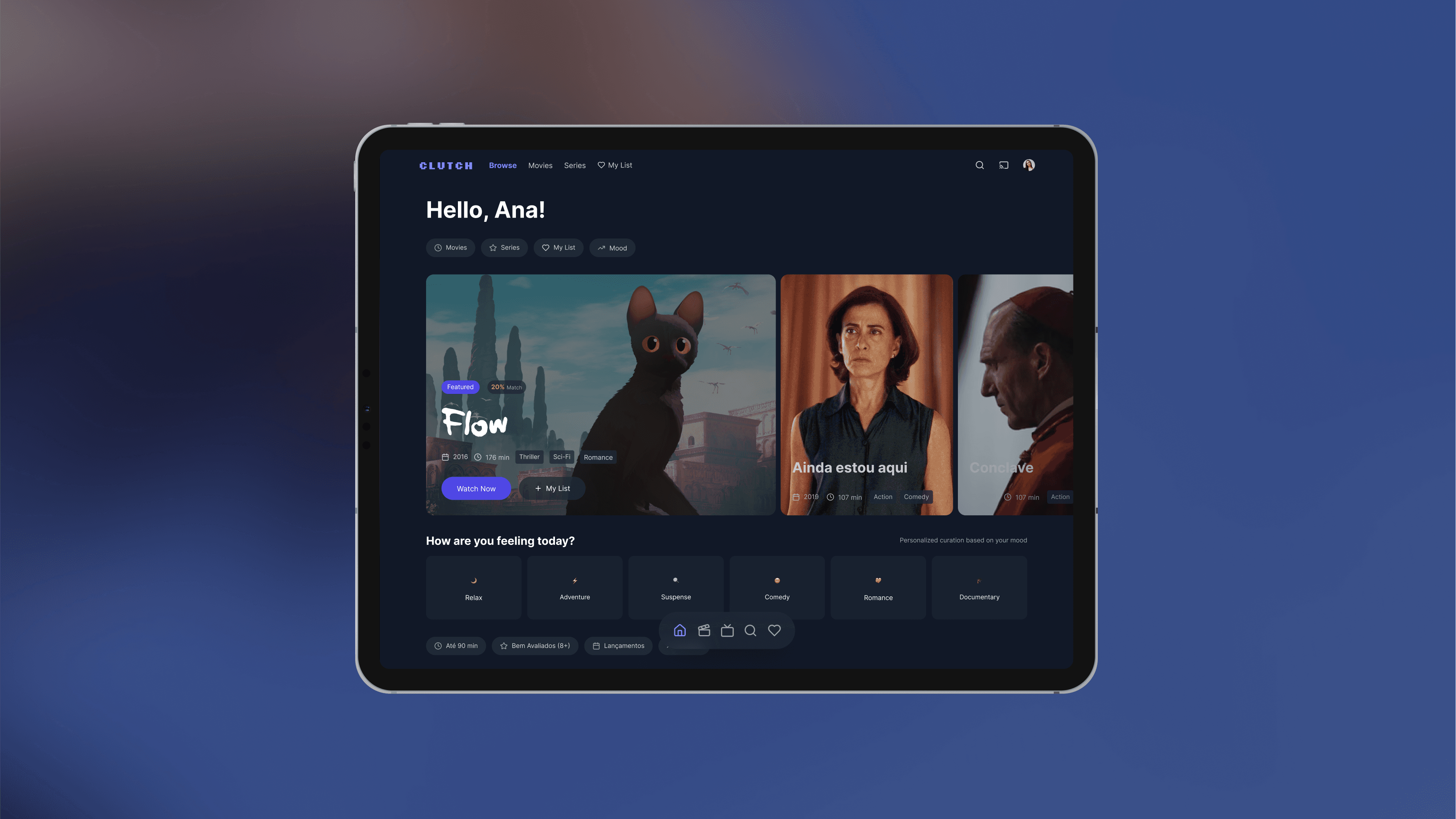 This project is an end-to-end case study for Clutch, a conceptual streaming platform designed to combat user "decision fatigue." Developed as my final project for the EBAC Product Management course, it demonstrates a complete product lifecycle—from strategic analysis and user research to MVP definition and a go-to-market plan. The core concept is a service that uses intelligent, mood-based curation to deliver a truly personalized viewing experience.