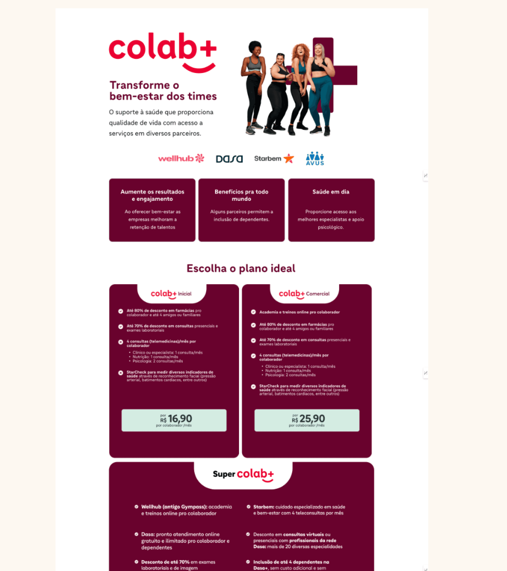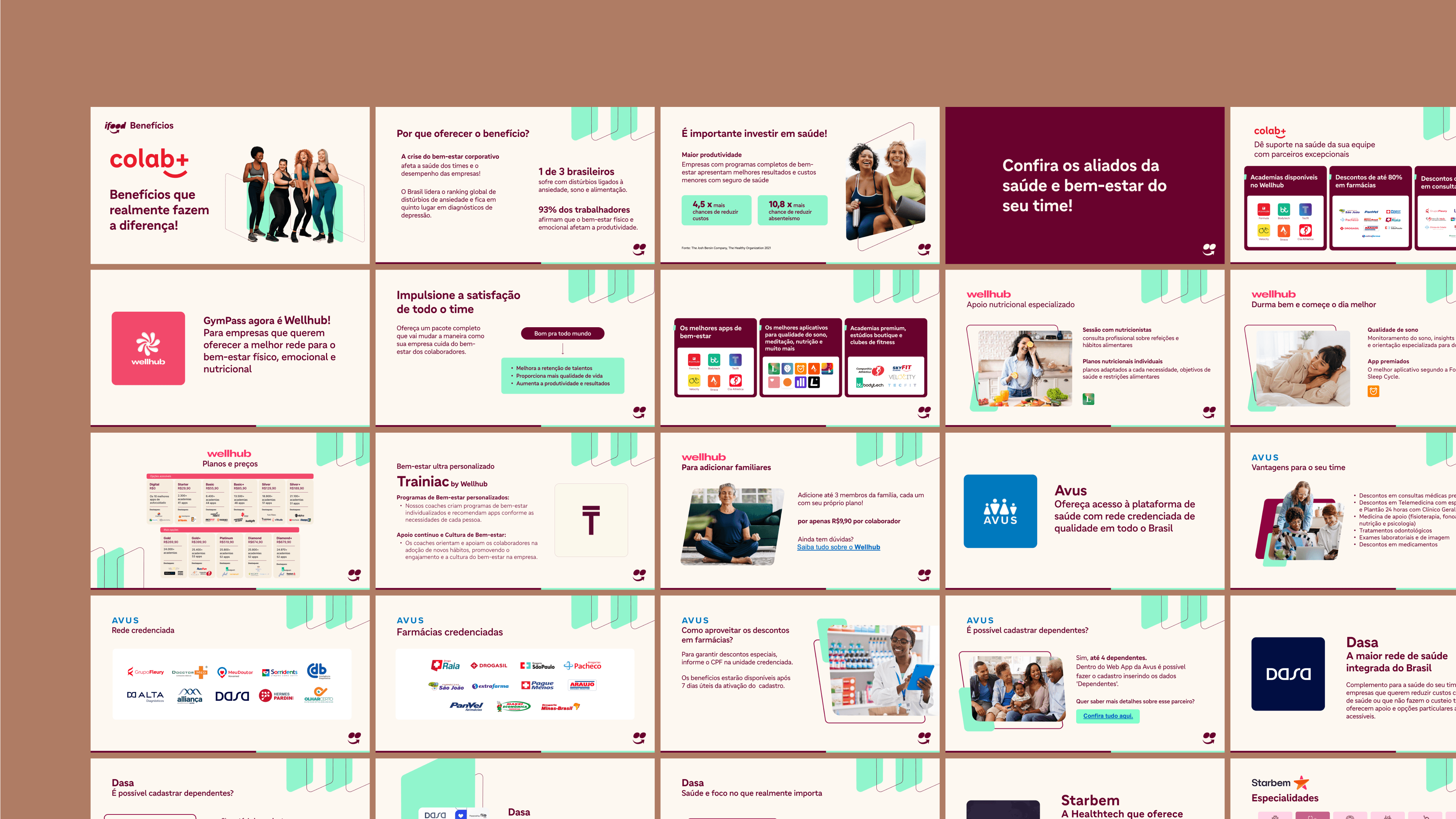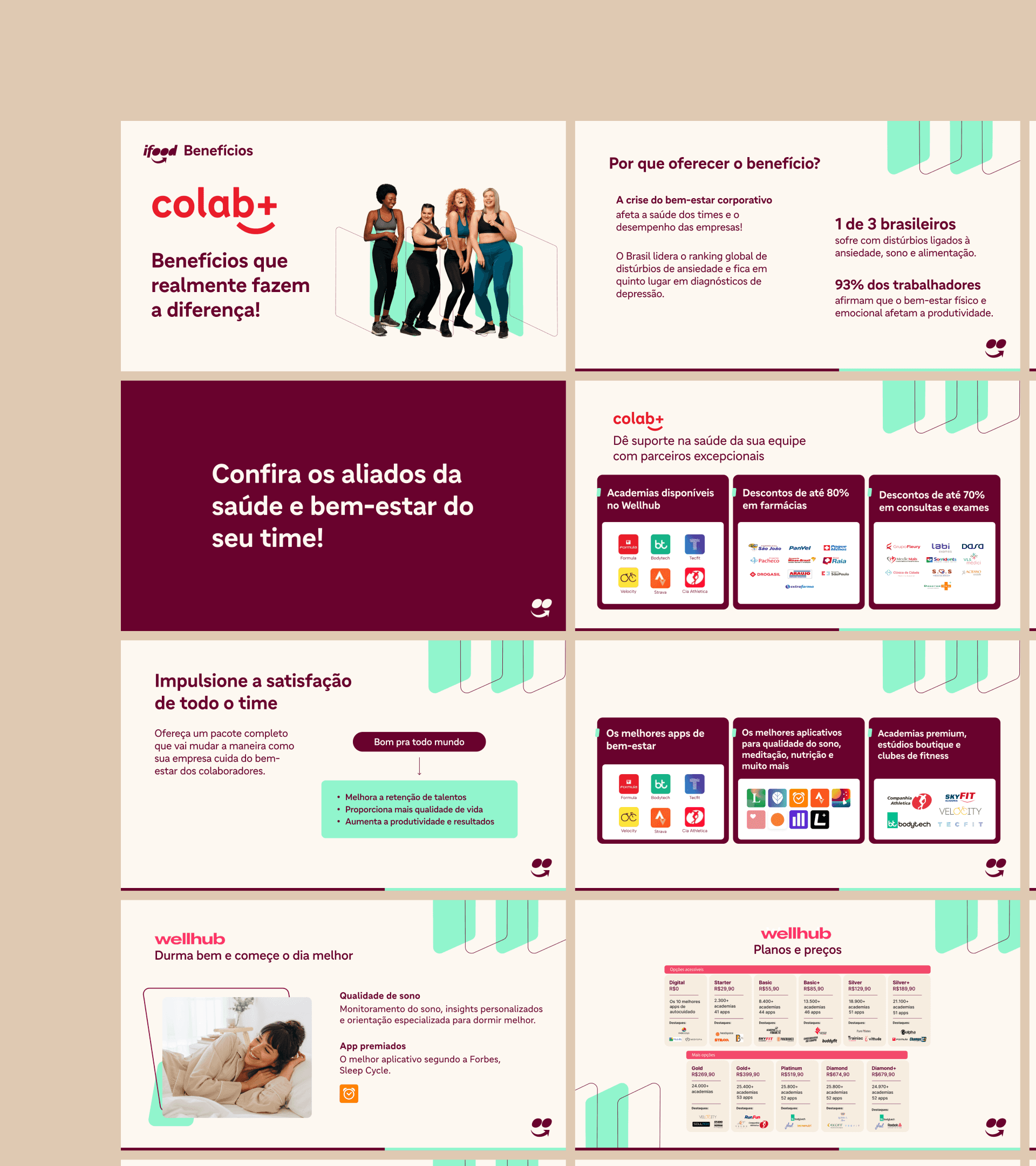Another relevant project was Colab+, the ecosystem's corporate well-being program. I created a pitch that didn't talk about health, but about impact: using data from The Josh Bersin Company, we showed that companies focused on well-being are 10.8 times more likely to reduce work absences. In the product, I executed the communication strategy, video editing with motion, CRM flows, and the commercial presentation.