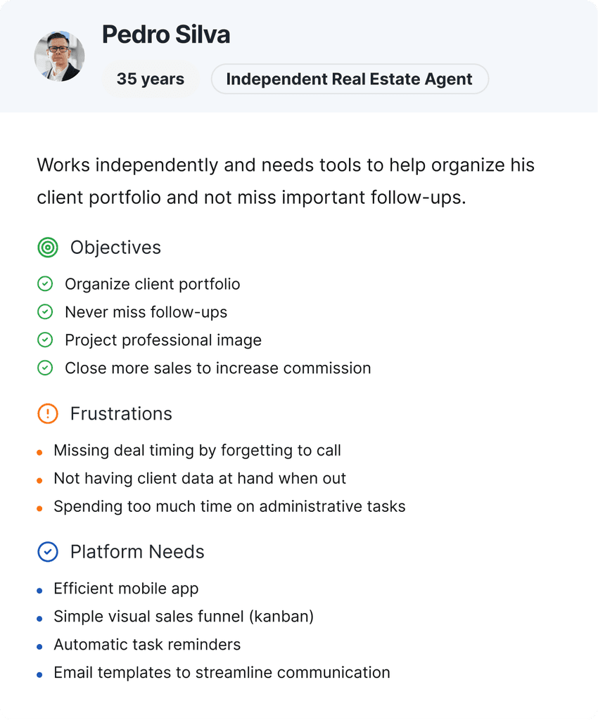 Real estate agents and agency managers need an effective way to manage a large volume of contacts (leads) at different stages of the buying process. Currently, they struggle with data disorganization in spreadsheets and inconsistent manual follow-up, which leads to the loss of qualified leads and a drop in productivity. This directly results in fewer closed deals and an inability to measure the effectiveness of their marketing strategies.