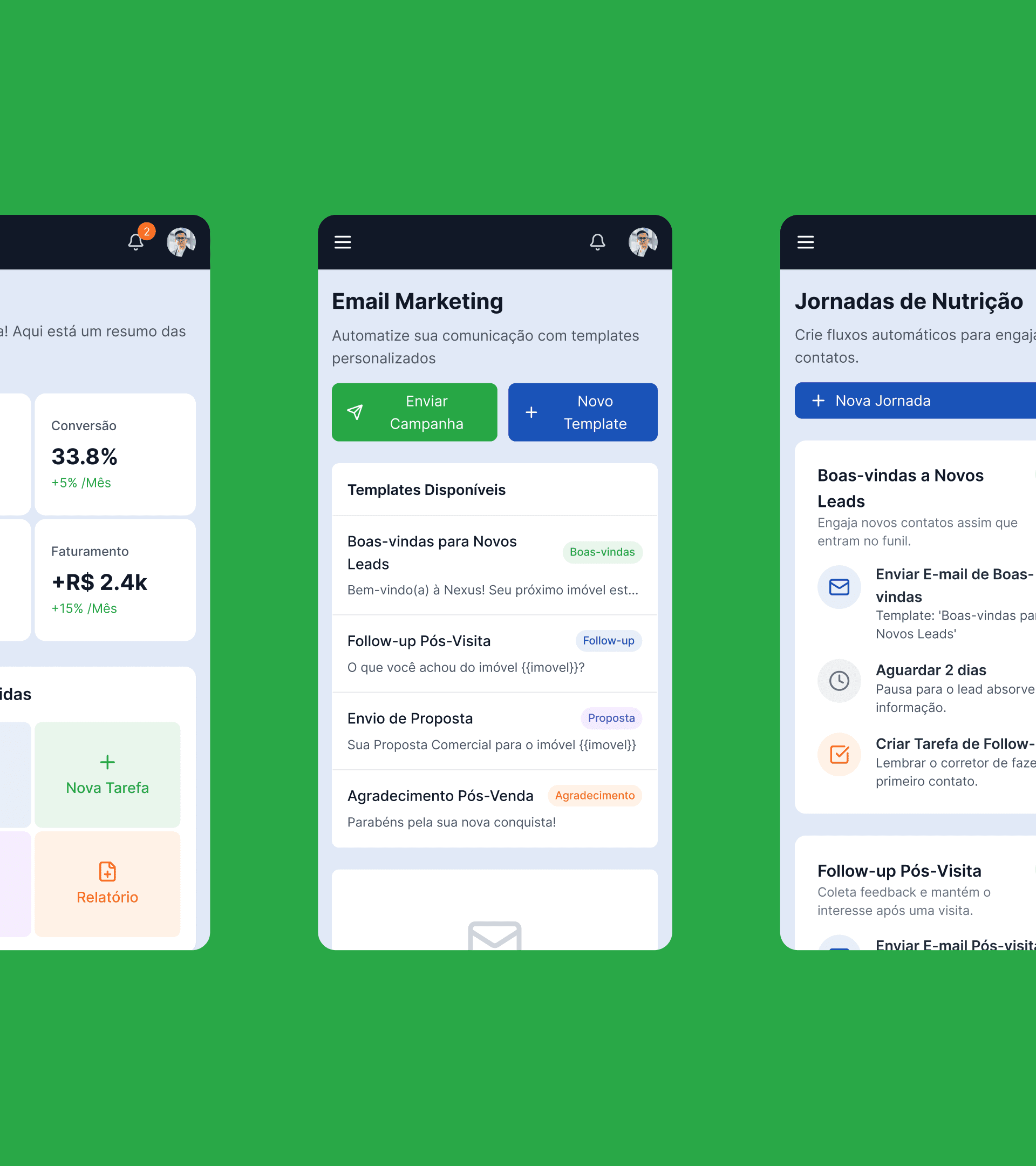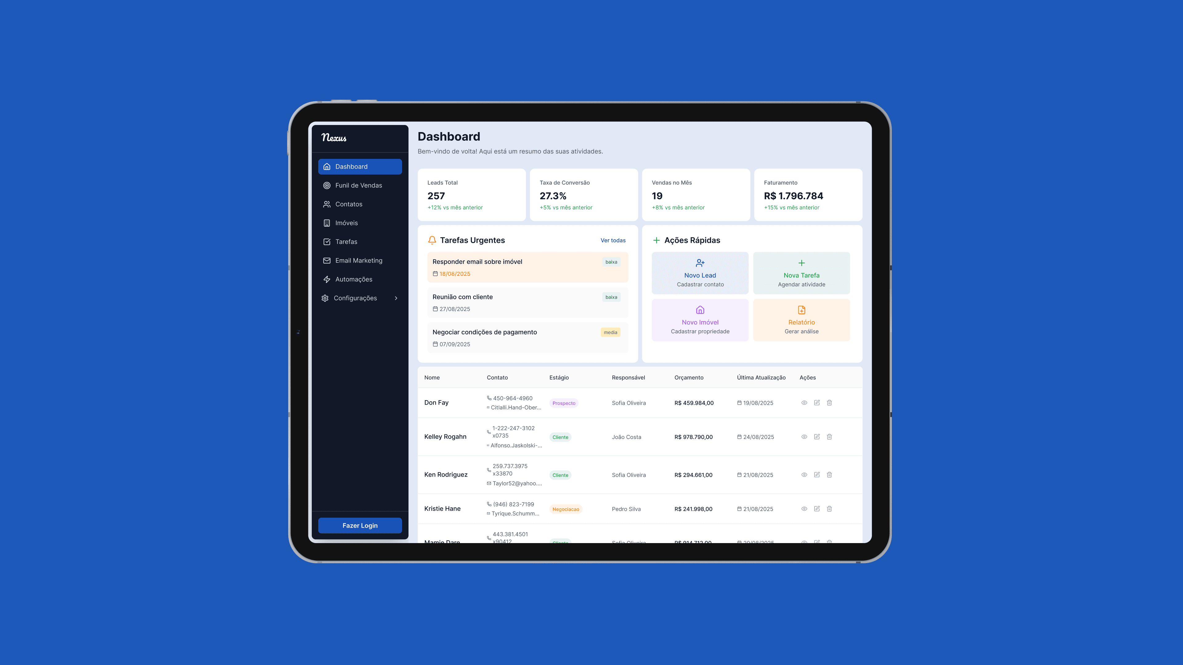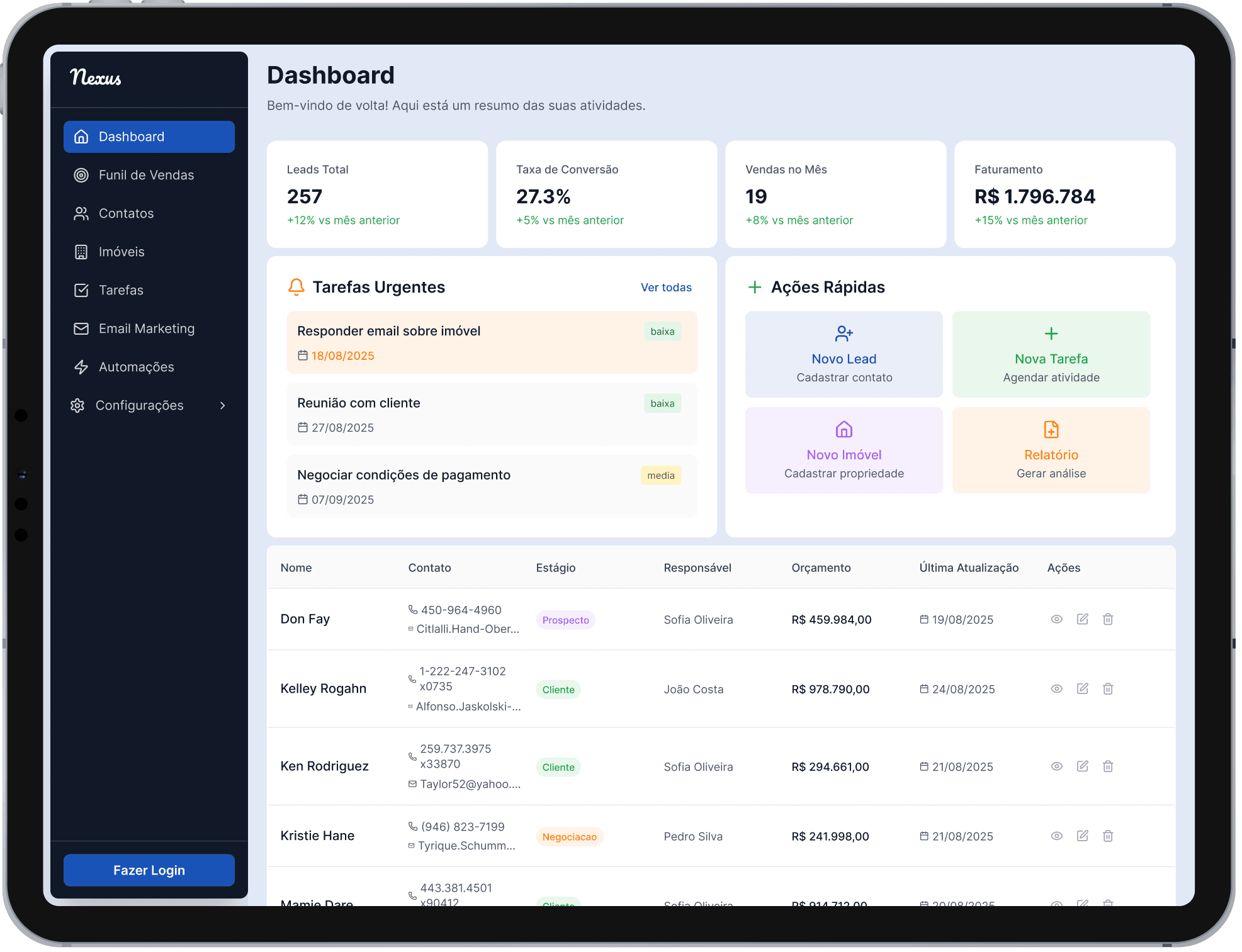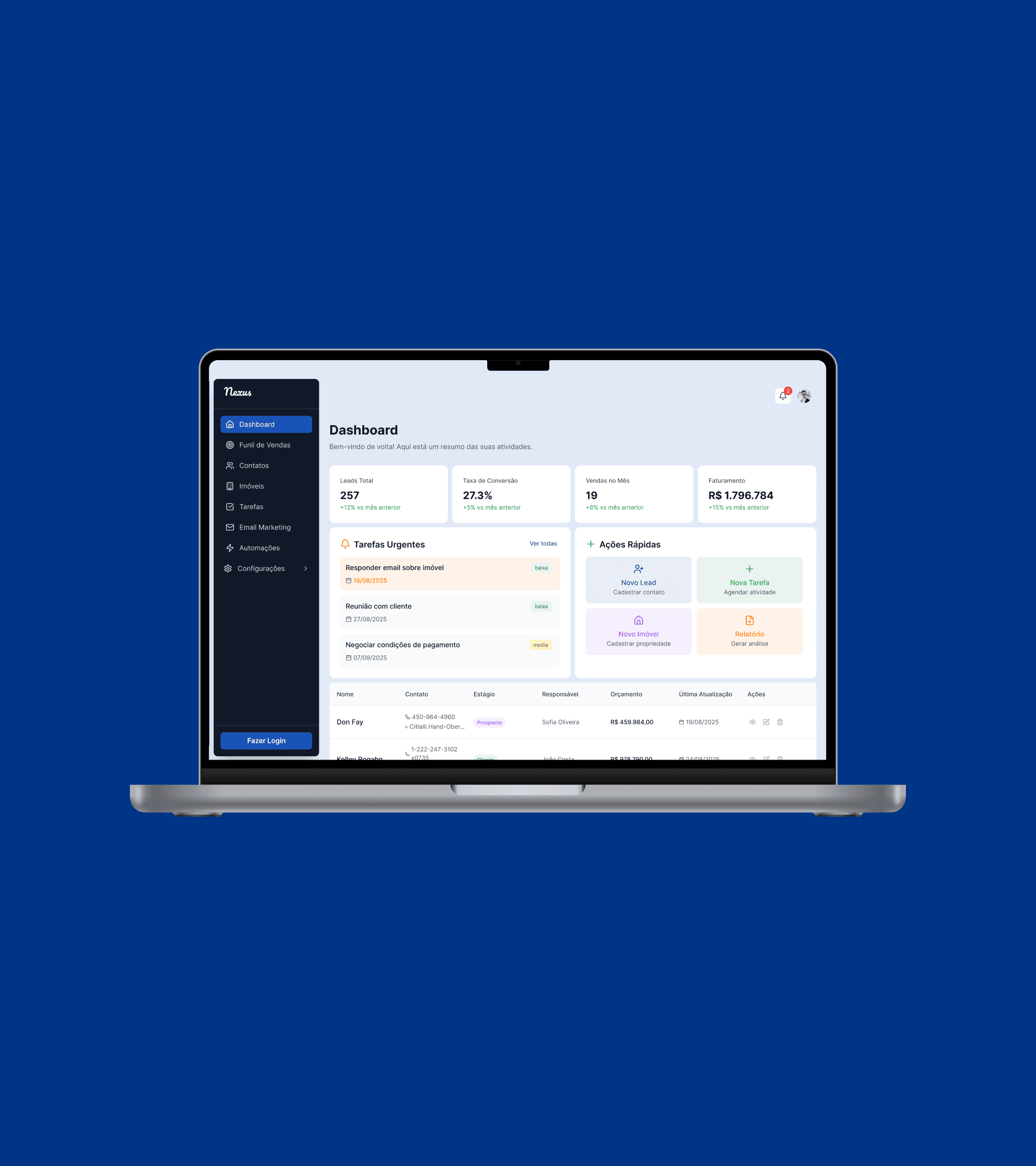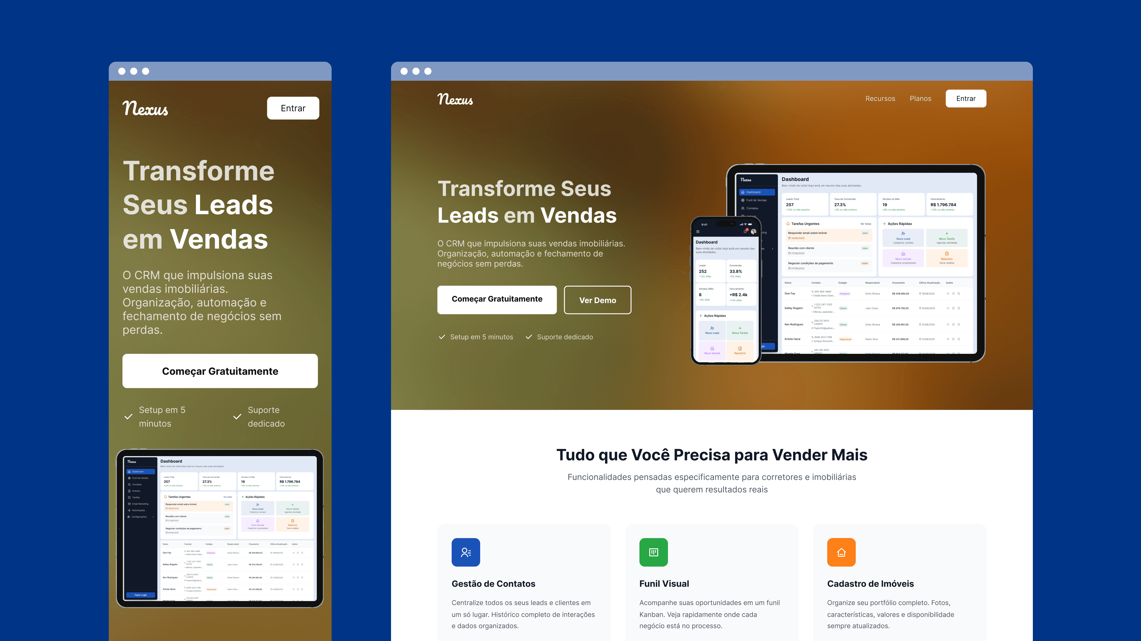 I developed the end-to-end concept for a specialized CRM for the real estate market, designed to turn disorganization into efficiency. Nexus automates communication, organizes the sales funnel into a visual kanban, and provides insights for agents and managers to close more deals, ensuring no opportunity is ever lost.
